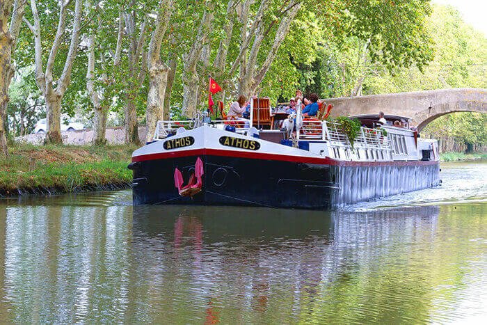 The 10 passenger Athos was built in 1964 as a commercial sand, grain and wine barge and was converted into a luxury hotel barge in 1982. Her association with wine continues today as she gracefully meanders through the Languedoc-Roussillon region of France. She is air conditioned throughout, has bikes available for passenger use a spacious sundeck to enjoy the passing scenery. Her five en-suite staterooms can be in either twin or queen-size double bed configuration and offer modern comforts. The spacious, traditionally decorated saloon, dining area, and bar are perfect places to relax. An English-speaking crew of four efficiently attends to your comfort and entertainment and ensures an unforgettable experience. Your captain has piloted Athos on the Canal du Midi for more than 20 years and his experience shows though his leadership of the master chef, tour guide and housekeeper.